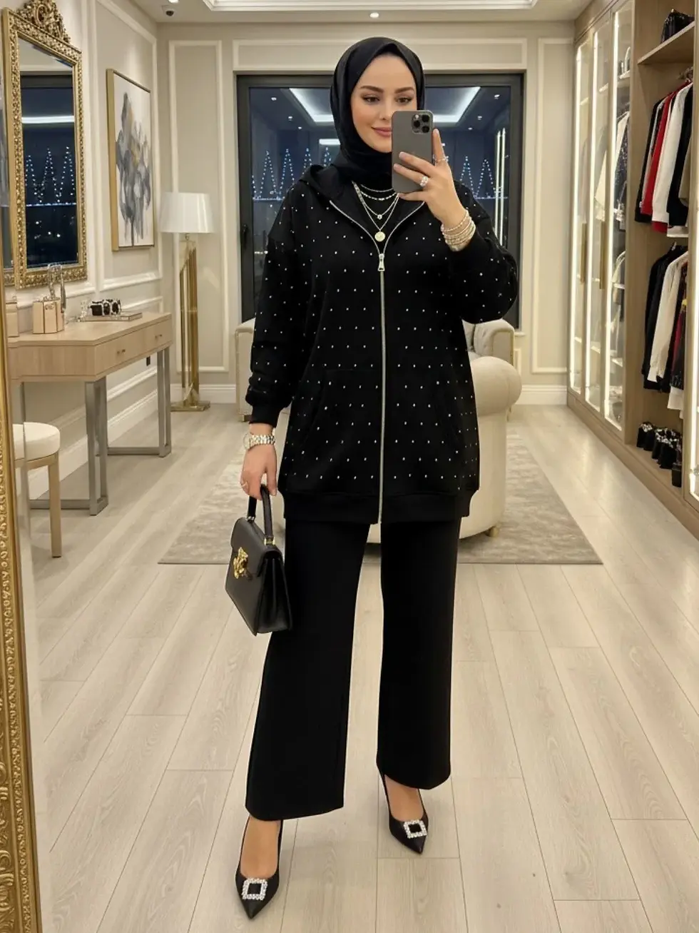 Taşlı Kapüşonlu Sweat Hırka HRK100365 – Siyah